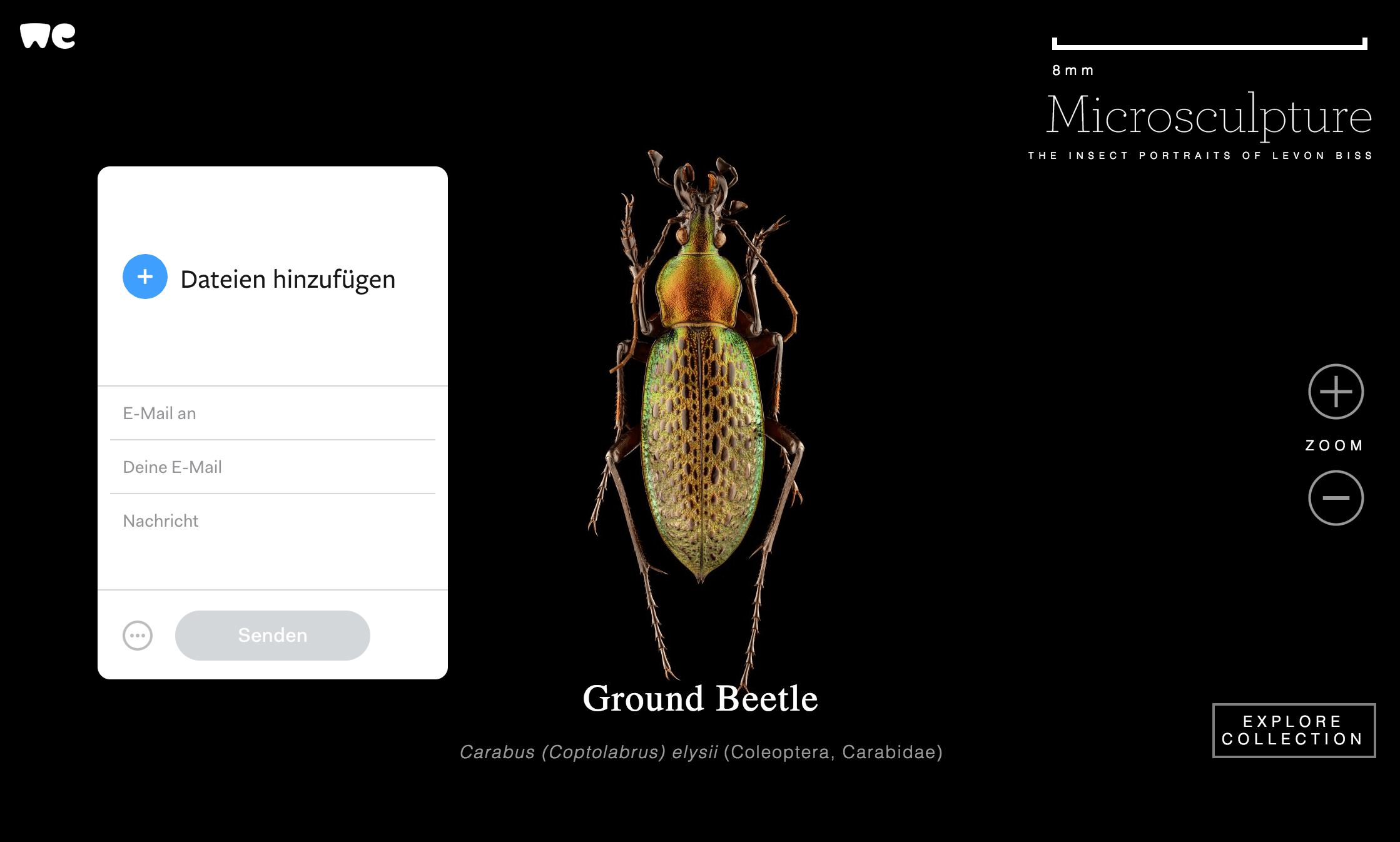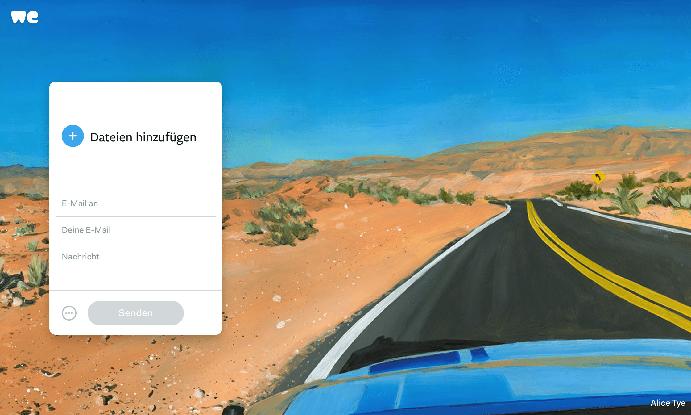 WeTransfer ist ein Onlinedienst zum Verschicken von großen Daten. Ihr Interface nimmt wenig Platz ein (siehe Bild) und lässt so Platz zur Präsentation von Arbeiten aus der Kreativbranche. Es können statische Bilder von Fotografen sein, oder interactive Microsites. So schafft sich WeTransfer eine kleine Community hinter ihrem Dienst und sie fördern Projekte die ihnen gefallen.